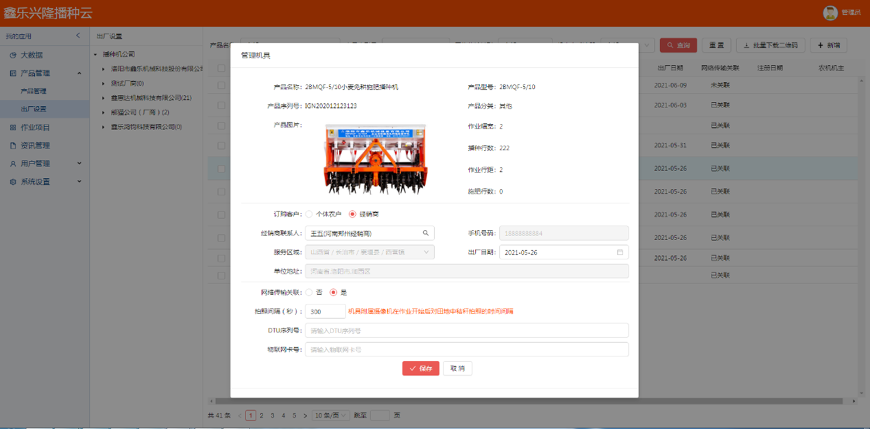 • 作業(yè)項目:為播種機(農機)生產(chǎn)廠(chǎng)家和播種機(農機)經(jīng)銷(xiāo)商提供作業(yè)項目跟蹤服務(wù)的功能。