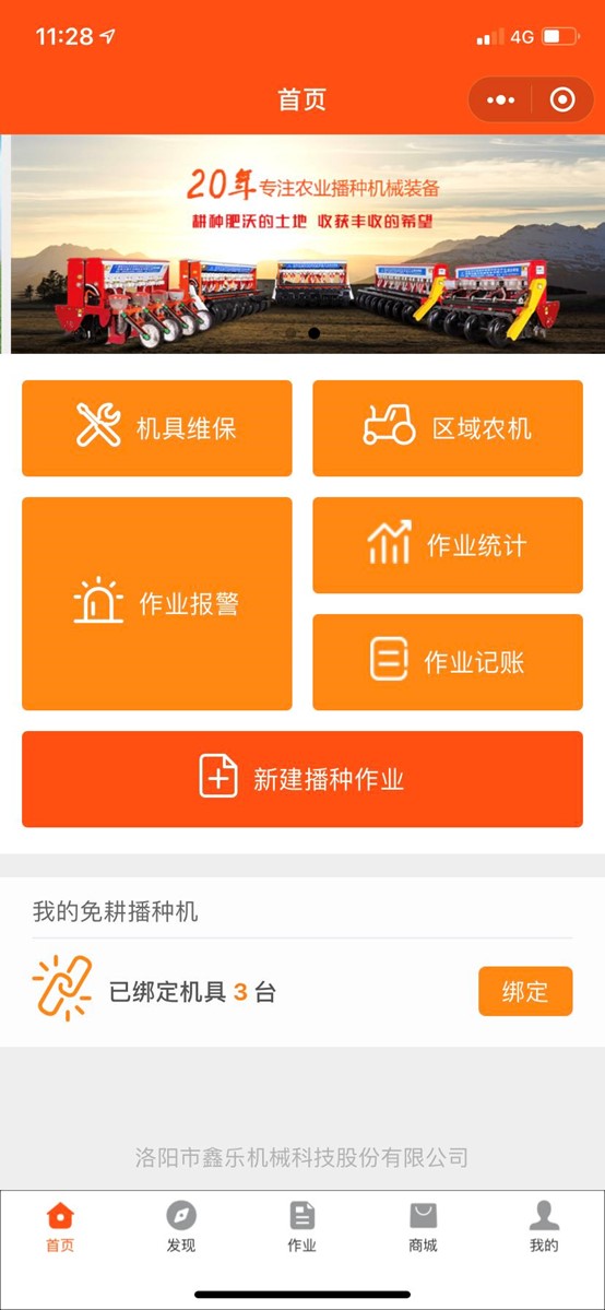 • 首頁(yè):為登錄用戶(hù)提供創(chuàng )建作業(yè)、機具維保、區域農機、作業(yè)報警、作業(yè)統計及作業(yè)記賬等重點(diǎn)功能的快捷入口。
