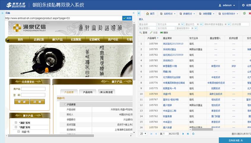朝陽(yáng)永續私募雙錄入項目是重構項目,主要用來(lái)實(shí)現基于金融報告等的數據的錄入、校對。系統實(shí)現了管理員對錄入和校對人員進(jìn)行授權并對錄入人員進(jìn)行分組,錄入人員1和錄入人員2使用平臺錄入數據,校對人員進(jìn)行校對、扣分、一致提交入庫等操作。系統通過(guò)雙錄入和校對機制從而減少了數據錄入的錯誤率,提高了數據準確性。